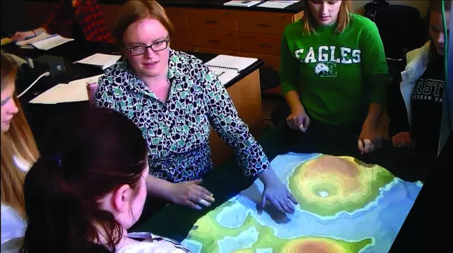View Original Image at Full SizeStudents at Eastern Michigan University explore the AR Sandbox with their lab instructor, Wendy Dorman.