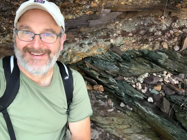 Dr. Michael Smith at an angular unconformity within the Precambrian Jacobsville Formation, L'Anse Bay, Michigan, 2018.