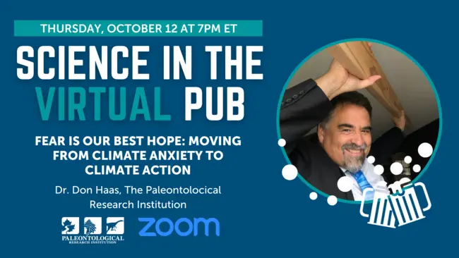 View Original Image at Full SizeA flyer for "Fear is our Best Hope: Moving from Climate Anxiety to Climate Action" in Science in the Virtual Pub, with a picture of the presenter.