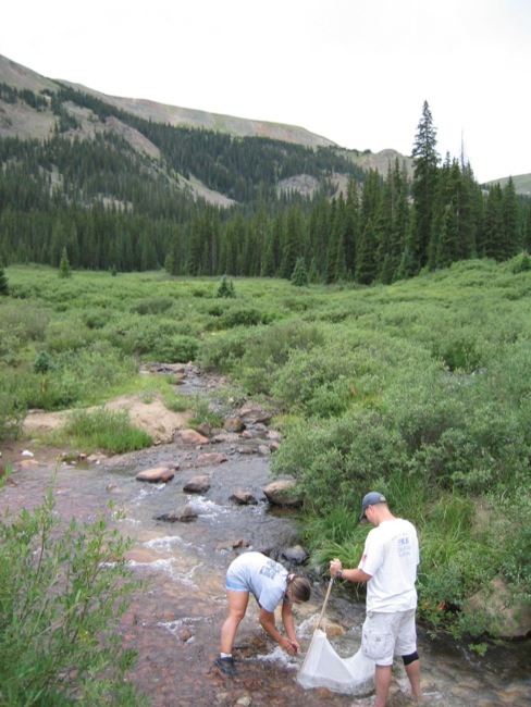 Students conducting a benthic invertebrate survey at the confluence of the Snake River (left) and Deer Creek (right).