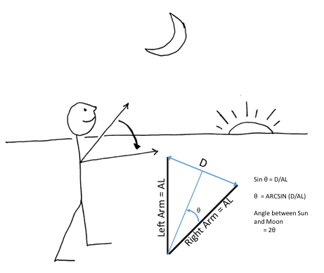 The angular distance between the Moon and the Sun can either be estimated visually (for example, by comparing the apparent angle with a protractor, or by breaking angles into parts, 45° degrees will be half of 90°, 22.5 °will be half of 45°, 11.25° will be one fourth of 45°), or by measuring the length of arms and the distance between hands in the method shown in the Figure 1.