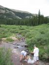 Have the students orient themselves on the topographic map. They should locate some major topographic features (Satafe Peak, Sullivan Mountain, Teller Mountain) and determine which stream is the Snake River and which one is Deer Creek. Tell the students the objective of the exercise is to gain an understanding of the physical and geochemical hydrology of this system. They should make a sketch map of the area by walking up the Snake River, Deer Creek, and downstream from the confluence. Tell them they are expected to make observations and take notes, paying particular attention to the characteristics of the stream bed.