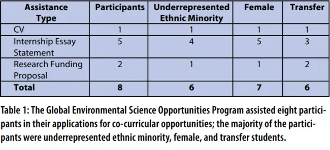 Table 1: The Global Environmental Science Opportunities Program assisted eight participants in their applications for co-curricular opportunities; the majority of the participants were underrepresented ethnic minority, female, and transfer students.