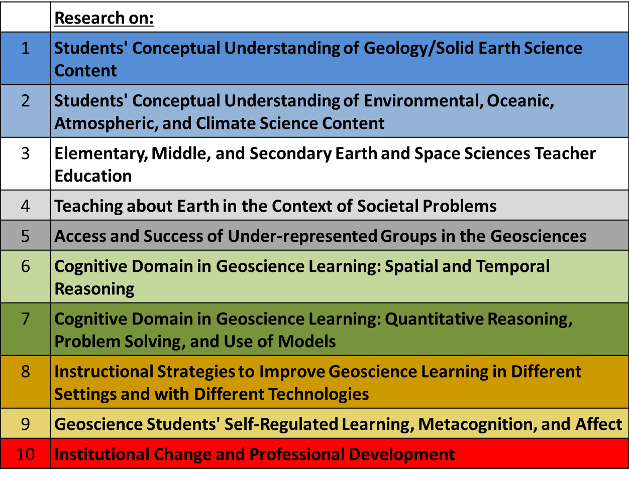 Citation for this chapter: St. John, Kristen; Bitting, Kelsey; Cervato, Cinzia; Kastens, Kim A.; Macdonald, Heather; McDaris, John R.; McNeal, Karen S.; Petcovic, Heather L.; Pyle, Eric J.; Riggs, Eric M.; Ryker, Katherine; Semken, Steven; and Teasdale, Rachel (2018). "Synthesis: Discussion and Implications". In St. John, K (Ed.) (2018). Community Framework for Geoscience Education Research. National Association of Geoscience Teachers. https://doi.org/10.25885/ger_framework/12